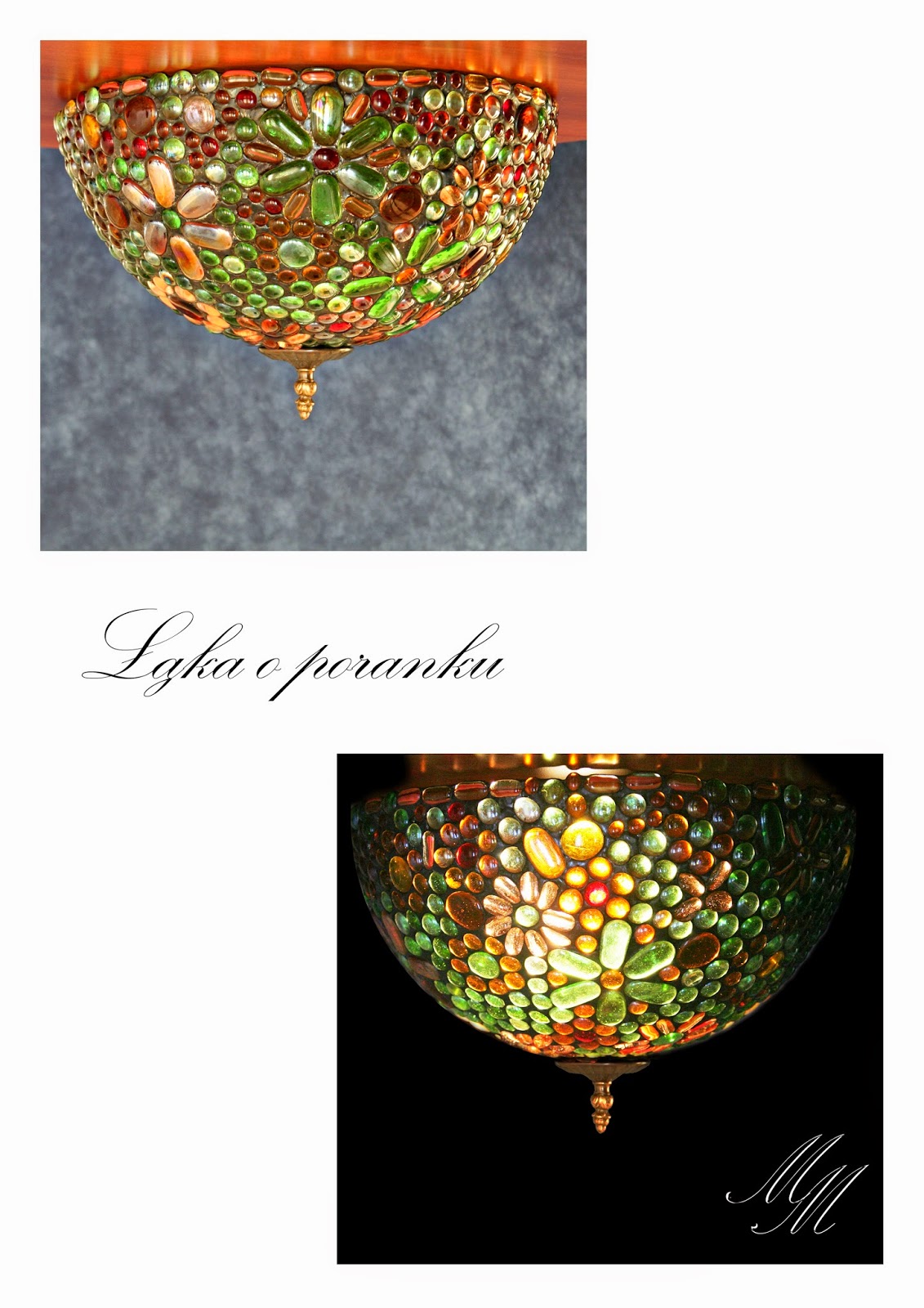 Nie mniej pracę nad plafonem zaczęłam dużo wcześniej - jak tylko Bronia powiedziała mi, że marzy jej się taki kaboszonowy żyrandol. Pierwsze kaboszony okleiłam folią miedzianą już w kwietniu. Plafon trafił do Broni 31-go lipca. 1-go sierpnia znalazł się na swoim miejscu docelowym. Tak więc proces powstawania "Łąki o poranku" był procesem dość długotrwałym.