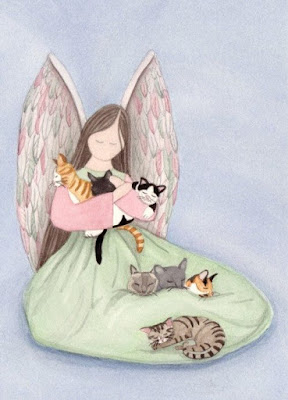 Źródło Pinterest: Sitting angel with cats (Tabby, Tiger, Siamese, Calico, Tuxedo) / Lynch signed folk art print by watercolorqueen on Etsyodaj |